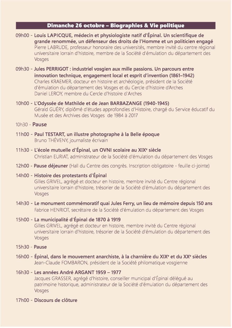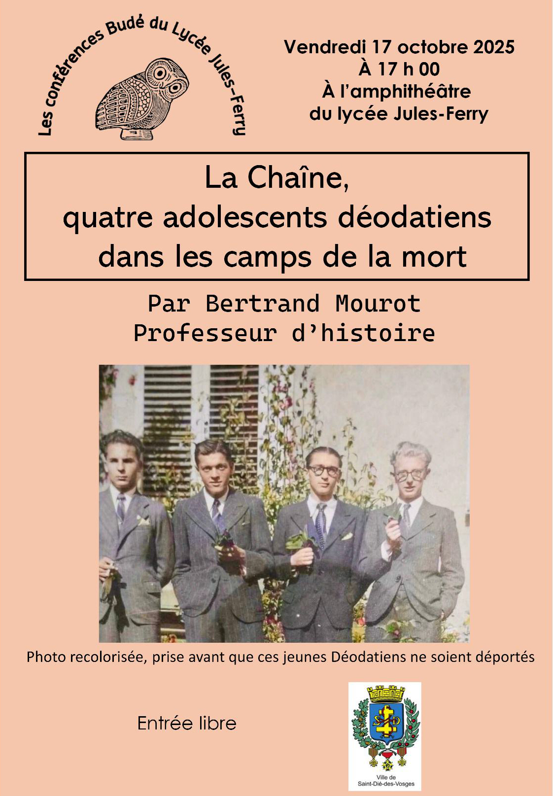 Le 05/10/2024, de 13h00 à 13h45, Lycée Jules-Ferry – Amphithéâtre, 48 rue Saint-Charles Avec Yann PROUILLET, historien, Société Philomatique Vosgienne, éditions EDHISTO « Une nécropole classée à l'UNESCO : Les Tiges, la nécropole des Alpins » Le 20 septembre 2023, l'Unesco a inscrit au patrimoine mondial 139 sites funéraires de la Première Guerre mondiale répartis en France et en Belgique. L'un deux est la nécropole nationale des Tiges à Saint-Dié-des-Vosges. Nécropole de synthèse à la forte identité alpine, Les Tiges conserve en son sein une Histoire et un patrimoine qui confirment le caractère mondial de ce haut lieu de Mémoire des Vosges. Le 05/10/2024, de 17h00 à 17h45, Lycée Jules-Ferry - Amphithéâtre. Dimanche 29 septembre à 17h00 : concert à la chapelle Saint Déodat Évènement à la Chapelle Saint-Déodat à Saint-Dié-des-Vosges