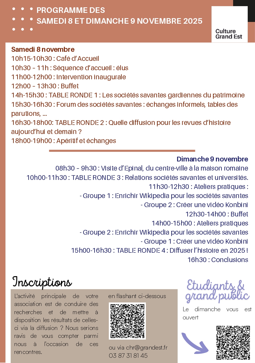 Stann Duguet, violoncelliste fantastique, et Lorrain de surcroît, est bien connu dans la région, entre autres comme initiateur du Festival Résonuances au Tholy, et il se produira également avec son Quintet, l' Ensemble Némésis à l'espace Georges Sadoul, le 2 février 2025, mais d'ici là, venez nombreux découvrir son projet solo dans le berceau de la ville ! Dimanche 29 septembre à Kaysersberg : 39ème congrès des historiens fiche d'inscription disponible en cliquant sur l'image Dimanche 22 septembre de 14h30 à 15h30 : église St Martin de St Dié et de 16h00 à 17h00 église paroissiale St Georges de Taintrux Nombre d’églises lorraines, notamment dans le diocèse de Saint-Dié, ont conservé des chemins de croix remarquables. Certains, composés de Samedi 21 septembre et dimanche 22 septembre : WE portes ouvertes au musée Fonck à Saulcy Dans le cadre des journées du patrimoine national, l’association pour la mémoire de René Fonck, organise un week-end portes ouvertes, le samedi et le dimanche. Samedi 21 septembre : Portes ouvertes de la chapelle de Robache (Saint-Dié-des-Vosges) Journées Européennes du Patrimoine : La chapelle Saint-Sébastien de Robache La chapelle sera ouverte pour la visite libre de 10 h à 12 h puis de 14 h à 17 h. Programme des journées du patrimoine : https://www.ca-saintdie.fr/images/Agenda/JEP2024_36_pagesWEB.pdf Vendredi 20 septembre à 17h00 : conférence Budé L'association Budé reprend ses conférences le 20 septembre avec comme sujet Les femmes à barbe en France de 1850 à 1939, une approche genrée. Elle sera proposée par l'historien Yannick Thomas. Voir affiche jointe. Jeudi 19 septembre et vendredi 20 septembre : EN FINIR AVEC LA SECONDE GUERRE MONDIALE ? LES CIVILS, ENTRE LIBERATION ET RECONSTRUCTION (France, Belgique, Luxembourg, Pays-Bas, Italie, Allemagne, Autriche), juin 1944 – 1946 Goethe-Institut Nancy Jeudi 19 septembre 2024