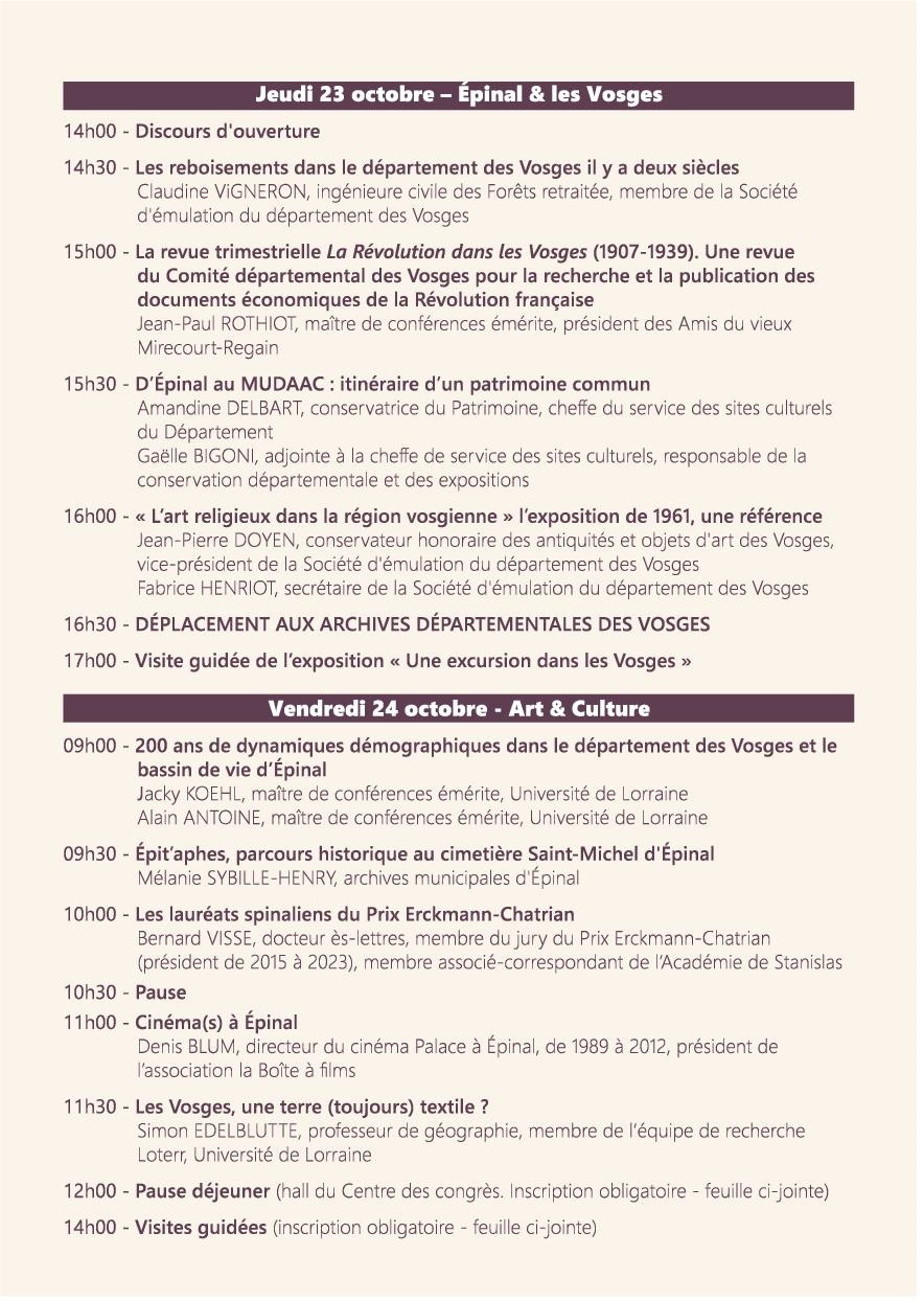 Avec les trois associations : ETC... Terra - Berian - Philomatique Vosgienne « En trois ateliers, remontez l'histoire du camp celtique de La Bure, partez à la rencontre de la faune vosgienne réelle et mythologique à l'époque gauloise et découvrez les amphibiens qui peuplent le site aujourd'hui. » Trois groupes pourront effectuer trois visites de 45 à 50 mn chacune sur 3 thèmes différents, il est demandé de réserver par messagerie ou téléphone. Samedi 23 mars à 9h45 : conférence Société l'Artillerie à la salle Carbonnar à Saint Dié "Historique de la Société l'Artillerie" . Entrée libre. Vendredi 22 mars à 20h00 maison de quartier de Marzelay (route des écoles) Jeudi 21 mars à 17h15 : conférence Budé Samedi 16 mars - conférence Temps de Guerre avec Jean-Claude Fombaron : Des artistes-cartographes à Saint-Dié : 1914-1918 "CATELAND, BRAUN ET GUÉTANT - TROIS ARTISTES TOPOGRAPHES À SAINT-DIÉ DURANT LA GRANDE GUERRE » Conférence "Temps de Guerre" par Jean-Claude FOMBARON Vendredi 15 mars à 20h00 : conférence BERIAN à Elan Association ELAN - Nayemont Les Fosses Lors de cette soirée, BERIAN présentera une conférence sur le sujet de la forêt vosgienne la nuit et des inquiétudes qu’elle a pu engendrer au cours du temps. Nous y découvrirons des créatures entre le réel et l’imaginaire à l’image du Houéran, la créature hurlante mi-homme mi-bouc qui puise son inspiration dans l'oiseau nocturne, le Hibou Grand-duc ». Jeudi 14 mars 2024 : conférence de Yves Bastien à Bruyères Du 16 au 19 mars : exposition à la salle des fêtes de Bruyères Vendredi 15 mars à 17h15 : conférence Budé Vendredi 1er mars 2024 à 20h45, conférence Berian à la Cholotte Vendredi 23 février à 17h15 : conférence Budé Pour ceux qui le souhaitent, la conférence sera précédée de la projection du film à partir de 15 h 00 (le film dure un peu moins de deux heures). Samedi 17 février 2024 dès 14h30, salle polyvalente de Bionville. Assemblée générale des Amis de la Hallière Vendredi 16 février à 20h : conférence débat avec Olivier Claudon à la maison des associations à Saâles Olivier Claudon a écrit trois romans dont deux sont vraiment passionnants. Le premier est un roman policier qui se passe à Strasbourg durant la semaine où la ville, en 1939, a été évacuée. Le second raconte les pérégrinations du premier convoi humanitaire parti de Strasbourg en 1993 pour ravitailler Sarajevo assiégé. Lundi 12 février 2024 à 17h15 : conférence Budé La prochaine conférence organisée par l'Association Guillaume-Budé sera inhabituelle à plus d'un titre. Elle sera collective et proposée par les élèves latinistes du lycée Jules-Ferry sous la direction de leur professeure Aurore Fèvre. Elle portera sur les sept merveilles du monde antique et aura lieu exceptionnellement le lundi 12 février à 17 h 15. Samedi 10 février 2024 de 15h à 17h : Conférence de Jean-Claude Fombaron sur : "Les fresques Minoux et Mangin de l'Eglise Sainte-Libaire" Lieu : Au rendez-vous des villageois 2, rue du Stade 88600 Lépanges-sur-Vologne Samedi 27 janvier 2024 à 14h00 au Musée de Saint Dié Vendredi 26 janvier à 20h45 : conférence Berian à la Cholotte L' association Berian ouvre un nouveau cycle de soirées découvertes intitulé "Des sites et des peuples" et sera inauguré par une première conférence sur le Lac de la Maix ! Vendredi 19 janvier 2024 à 17h15 : conférence Budé La prochaine conférence aura lieu le 19 janvier 2024 à 17 h 15 au lycée Jules Ferry. Elle sera proposée par Yann Prouillet et portera sur Georges Villa. jointe. Ci-dessous une présentation de la conférence par son auteur. Bref résumé de la conférence communiqué par Yann Prouillet: Dimanche 7 janvier, musée Pierre Noël : fête des Rois ! Rappel : ce dimanche, 1er du mois, l'accès au musée est gratuit pour tous. C'est aussi le dernier jour de l' exceptionnelle exposition Manessier . Samedi 16 décembre à 14h30 au musée Pierre Noël : Deux conférences Temps de guerre / Berian