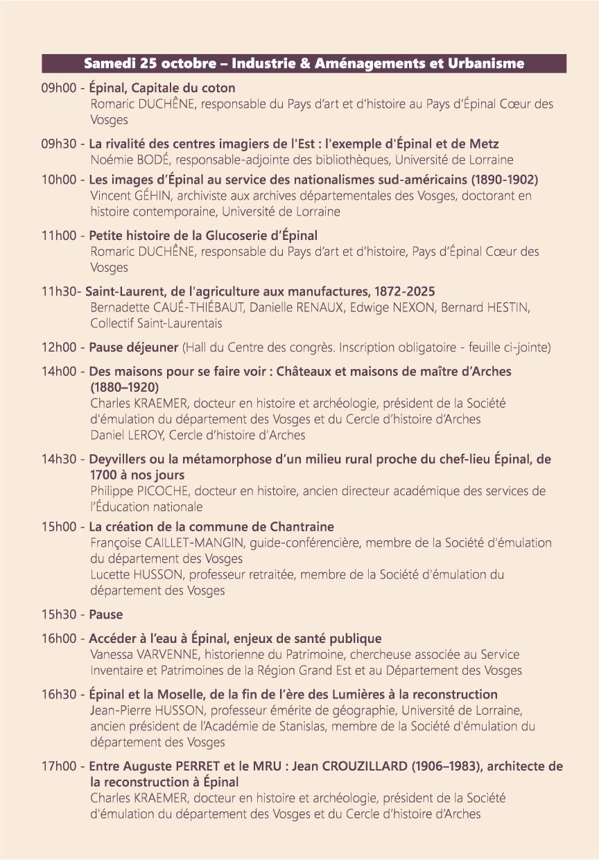 ActivitésPermanences au local : Tous les jeudis de 14h00 à 18h00 (sauf en août). ---------------------------------------------------------------------------------- 2025, la Société Philomatique Vosgienne fête ses 150 ans ! Samedi 8 novembre et dimanche 9 novembre : rencontres des sociétés savantes du Grand est à Epinal Jean Claude Fombaron intyerviendra le samedi. Il y aura un petit stand Philo samedi (JCF) et dimanche (Yann) Samedi 25 octobre à 17h00 à Allarmont : conférence Berian Le Darou : un animal imaginaire, une tradition cosmopolite. Jeudi 23 octobre à 20h00 salle Carbonnar : conférence La sorcellerie à Saint Dié Par Leïla Lambert et Thierry Choserot De la figure de la sorcière aux persécutions historiques : les sorcières de Saint-Dié et alentours Journées d'études Vosgiennes du 23 au 26 octobre à Epinal Vendredi 17 octobre à 17h00 : conférence Budé au lycée Jules-Ferry Festival International de Géographie -du 3 au 5 octobre : programme des interventions de la Philomatique Le Vendredi 3 octobre 18h00 - 19h00 RAON-L'ETAPE - Petite salle Beauregard Jean-Michaël CHOSEROT : Le château féodal, une marque du pouvoir seigneurial