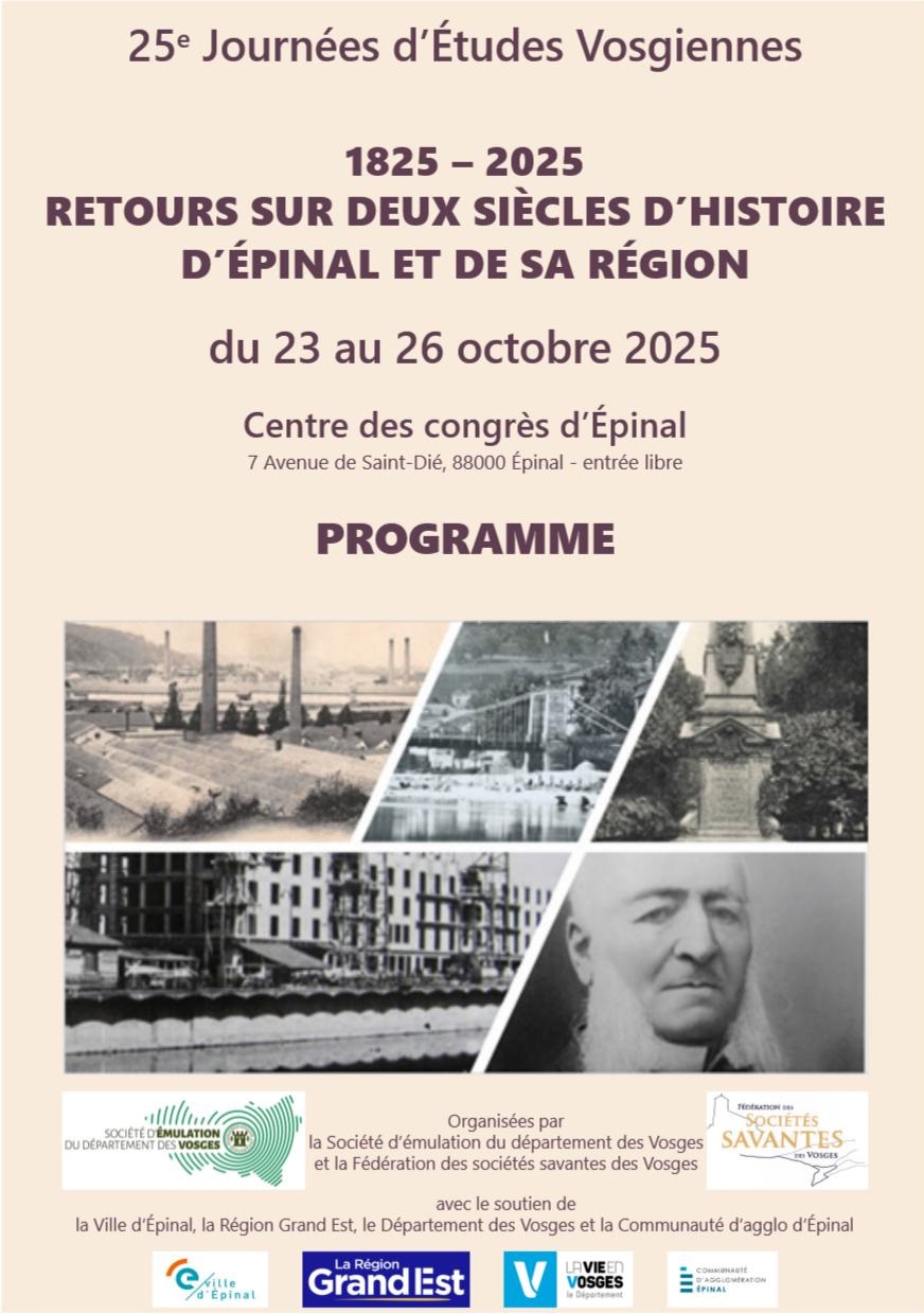 Le dimanche 5 octobre 17h00 - 18h00 GRANGES-AUMONTZEY - Salle des Fêtes Jean-ClaudeFOMBARON : Inscrire le pouvoir dans le paysage : les gibets seigneuriaux des Vosges, du XIIIe au XVIIIe siècle. Vendredi 26 septembre à 20h45 : conférence Bérian à la Cholotte Nouvelle date suite à l'annulation de la précédente pour des raisons indépendantes de notre volonté. Dimanche 21 septembre à10h00 : randonnée dans l'Ormont avec Bérian Évènement de Berian - Association Naturaliste et Historienne Vendredi 19 septembre à 18h30 : conférence Bérian au cinéma de Noiregoutte à Plainfaing Conférence vendredi 19 septembre à 18h30, Cinéma de Noiregoutte à Plainfaing à 18h30 Jeudi 18 septembre à 20h00 : conférence et exposition à la salle des fêtes de Bruyères CONFERENCE et EXPOSITION sur la vie de Jean-Baptiste MOUGEOT, savant naturaliste et médecin ayant exercé, au 19ème siècle, pendant 50 ans à Bruyères, organisée par la ville de Bruyères et l'Association Racines de Bruyères et présentée par Gérald GUERY et Christian BOURION Samedi 13 septembre à 14h30 : conférence Temps de Guerre au musée Pierre Noël "La 2e Division d'Infanterie Motorisée en Algérie, 1955-1962" . Entrée libre. Vendredi 5 septembre 2025 à 20h00 : conférence de Jean-Claude Fombaron au centre culturel de Remiremont La Société Philomatique Vosgienne fête ses 150 ans Pour marquer l’anniversaire de sa création en 1875, la Société philomatique vosgienne a l’honneur et le plaisir de vous inviter à son Colloque express : 150 ans au service du patrimoine des Vosges Samedi 30 août 2025 de 14h00 à 16h00 A l’issue d’une brève et synthétique table ronde, nous vous convions à découvrir à 16h45, l’exposition : La philomatique de musées en Musée montée en étroite coopération avec le musée Pierre Noël. En comptant sur votre attachement au patrimoine et aux associations qui le font vivre et connaître, Jean-Claude Fombaron Président de la Société philomatique vosgienne.