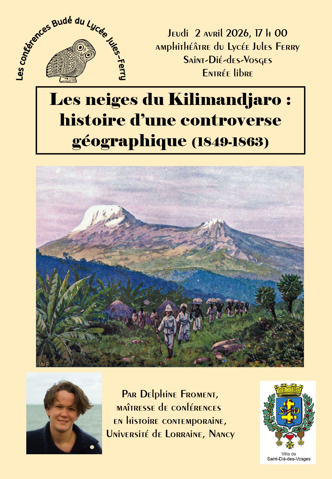La prochaine conférence organisée par l'Association Guillaume-Budé aura lieu le jeudi 2 avril à 17 h 00. Elle portera sur "les neiges du Kilimandjaro : histoire d'une controverse géographique (1849-1863)". Elle sera proposée par Delphine Froment, maîtresse de conférences à l'Université de Lorraine.