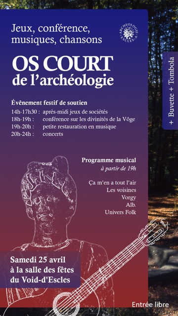 Escles-Archéologie organise un évènement festif et culturel de soutien le 25 avril 2026 au Void-d’Escles qu’on a appelé OS COURT parce qu’on aime l’humour (cf. affiche en pièce jointe)